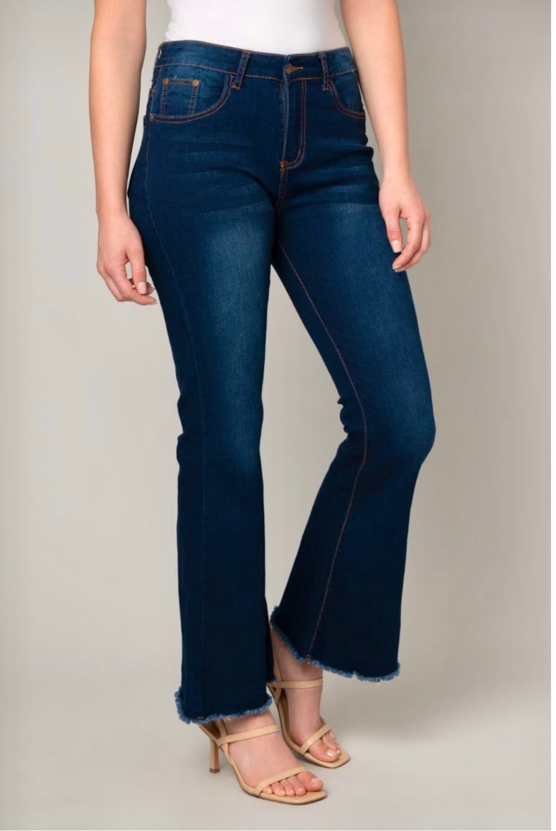 Flared jeans with a frayed hem line. Stretchy fabric.