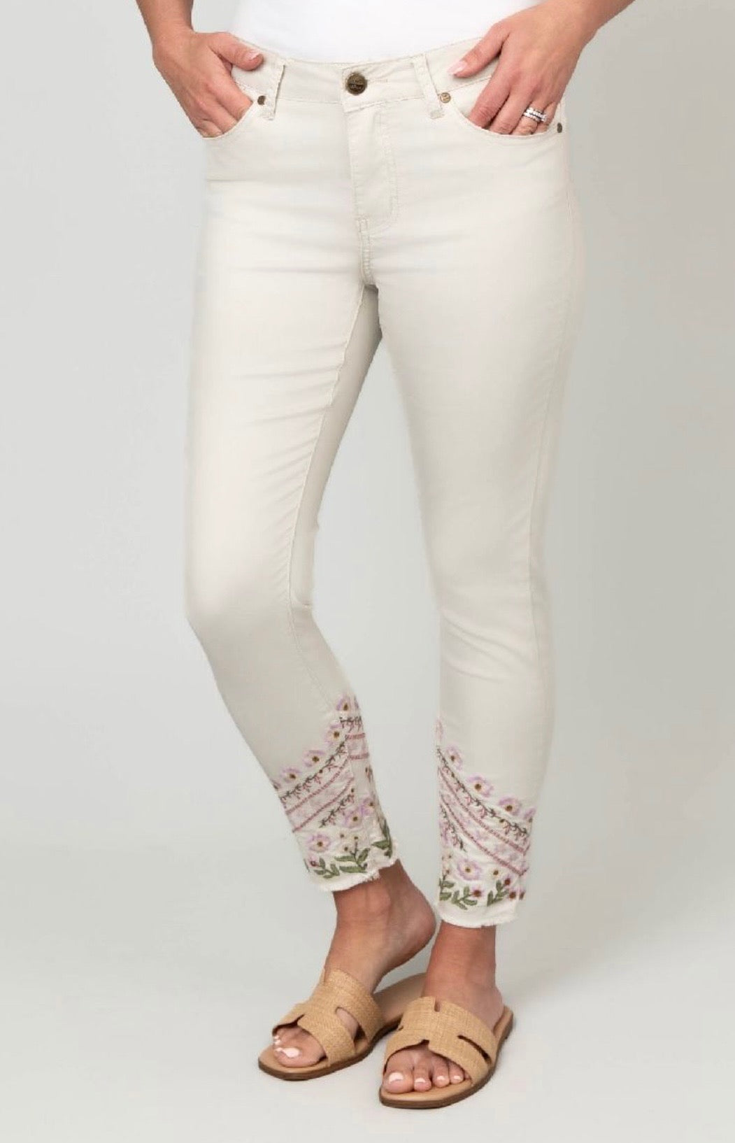 Cropped length skinny jeans with embroidered detail at the bottom. Runs small in legs.